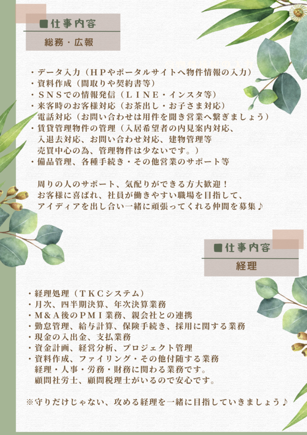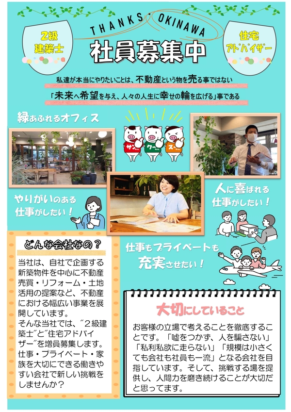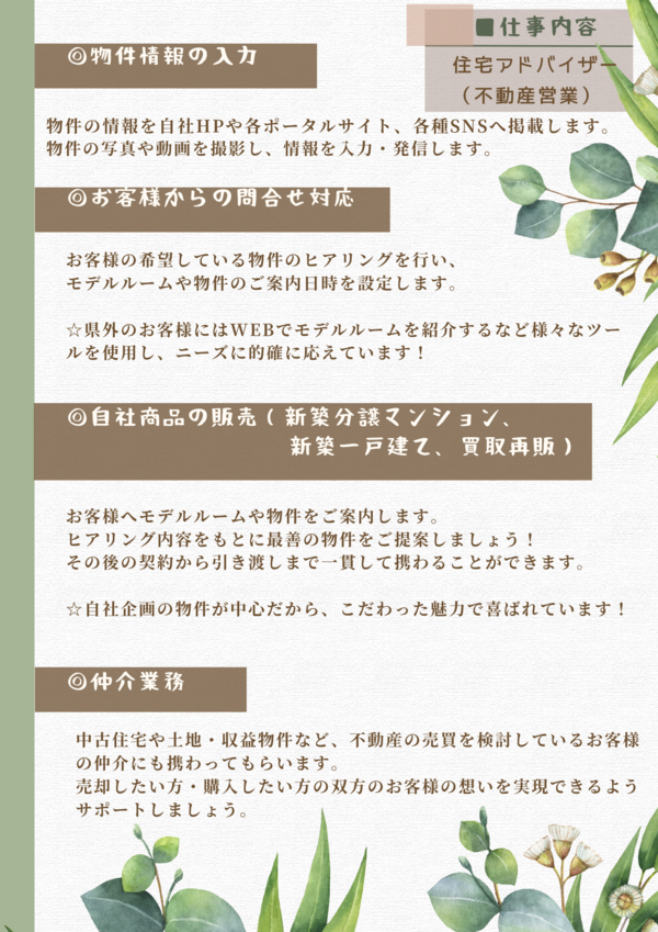 当社は分譲マンションの企画から販売、一戸建住宅の企画販売、リフォーム、仲介業、不動産コンサルティング業と、不動産全般を取り扱っている会社です。